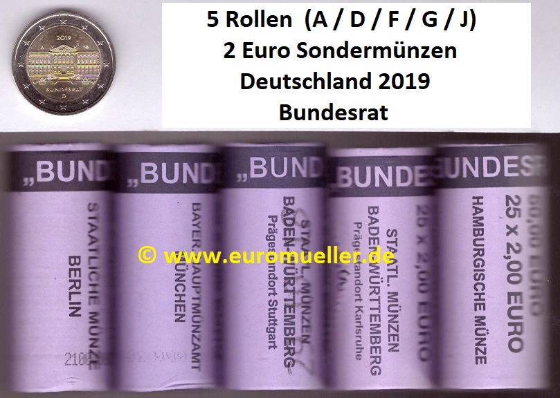 5x Rolle 2 Euro Sondermünze Deutschland 2019 Bundesrat