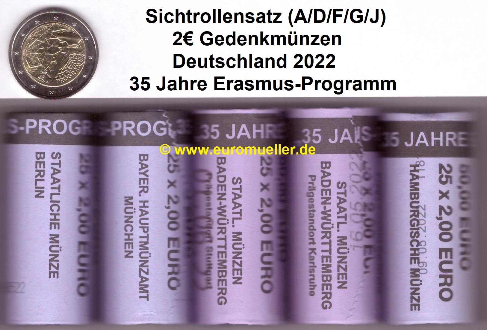 5 Rollen 2 Euro Sondermünzen Deutschland 2022 Erasmus