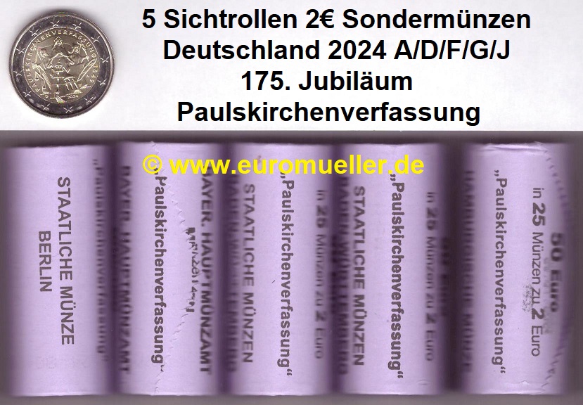5x Sichtrolle 2 Euro Sondermünze Deutschland 2024 Paulskirchenverfassung