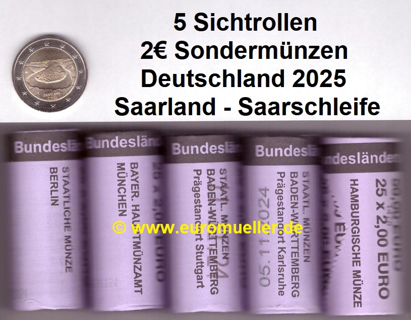 5 Rollen 2 Euro Sondermünzen Deutschland 2025 Saarland